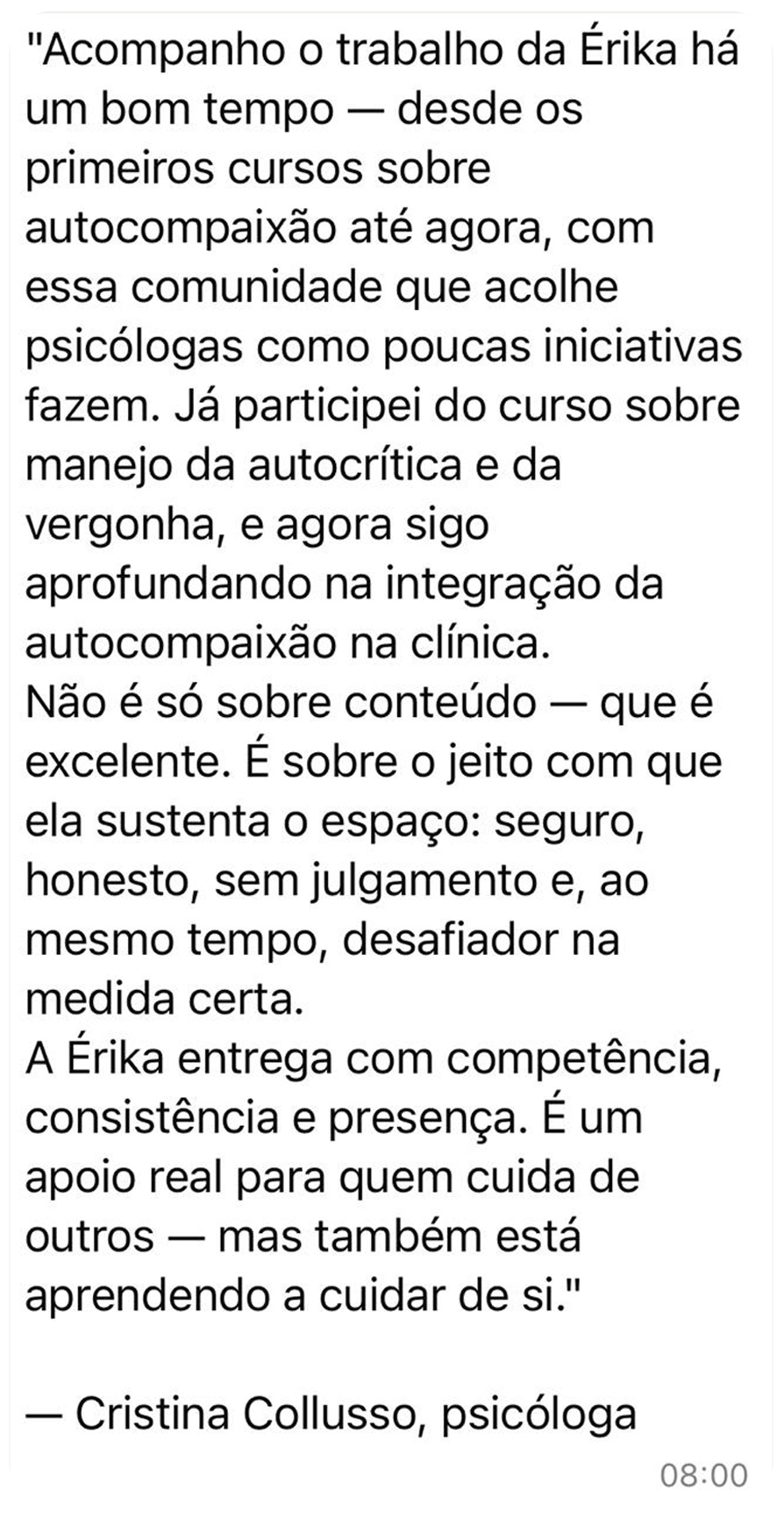 Psicóloga, Mestre em Psicologia Clínica e Doutora em Ciências pela USP, especialista em Terapia Focada na Compaixão (TFC), Mindfulness e Autocompaixão na psicoterapia. Com ampla experiência clínica e acadêmica, ajudo psicólogos a integrar essas abordagens com ética, profundidade e embasamento científico. Como supervisora e professora certificada do programa Mindful Self-Compassion (MSC) pela Universidade da Califórnia San Diego (UCSD), ofereço cursos, supervisões e treinamentos para qualificar terapeutas no uso dessas práticas. Ministro aulas em cursos de formação e pós-graduação, contribuindo para a propagação do conhecimento. Sou Presidente passada da ACBS Brasil, comprometida com a disseminação e desenvolvimento das terapias contextuais no país. Minha missão é capacitar profissionais para aplicarem a compaixão de forma eficaz, transformando a prática clínica e promovendo bem-estar genuíno.